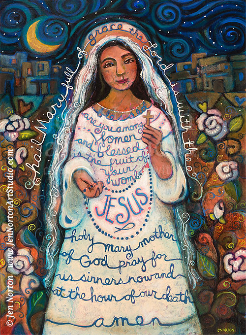 Folk Art acrylic painting of the Virgin Mary and her prayer, the Hail Mary