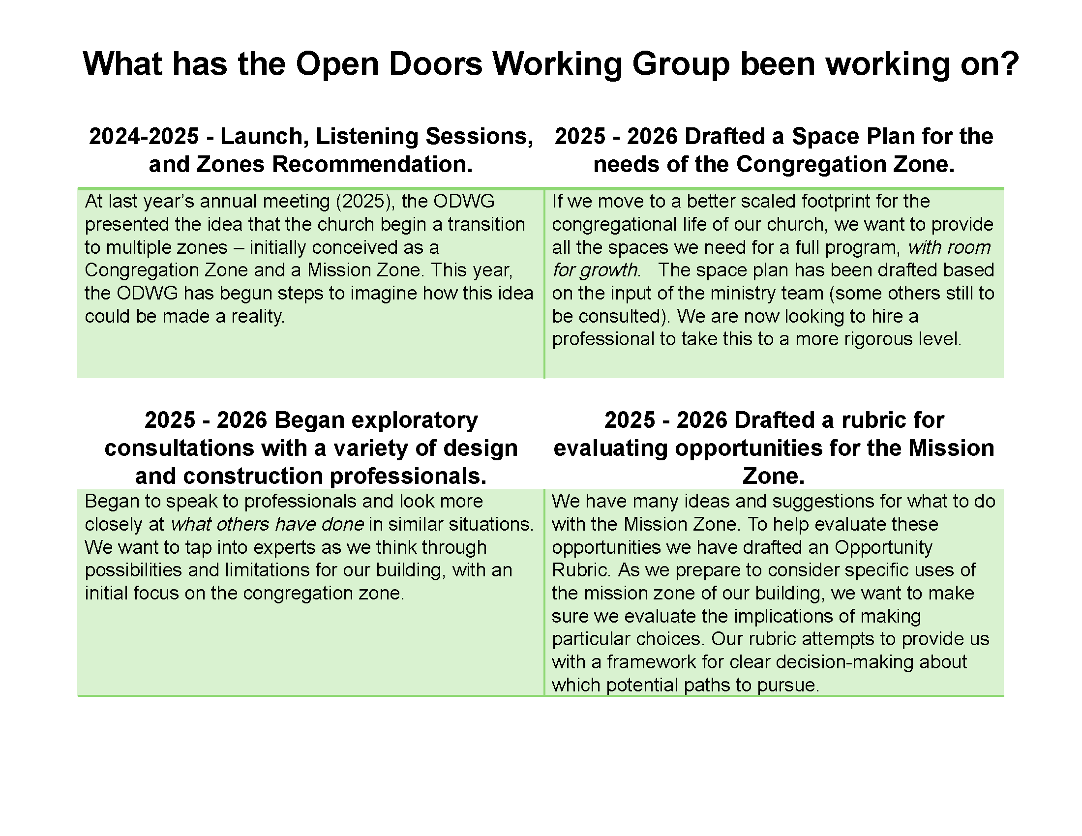 In this slide, we are giving a brief summary of what ODWG has done and is currently working on. Last year we sought input from the congregation, ministry team and staff. We took time to consider the complexities of the situation and came to the congregation, at the annual meeting in May, with a proposal that we imagine the building in two zones – a congregation zone and a mission zone. This year we have been starting the work of seeing how these two zones might take shape. We have a draft of a space plan, checking in with all the members of the ministry team to work out what space we need to support a flourishing and vibrant church. We have also created a draft rubric to evaluate the many ideas we heard from the congregation for the future use of the mission zone. We would love to have your thoughtful reaction to this rubric, in particular. Please share in this process of discovery of God’s leading. Let us know what you think!