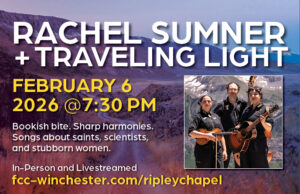 Bookish bite. Sharp harmonies. Songs about saints, scientists, and stubborn women. Live in person and live streamed from the stunning Ripley Chapel, First Congregational Church is pleased to present Rachel Sumner and Traveling Light, a Boston-based string band making music that blends folk tradition with feminist storytelling, poetic detail, and just enough grit.